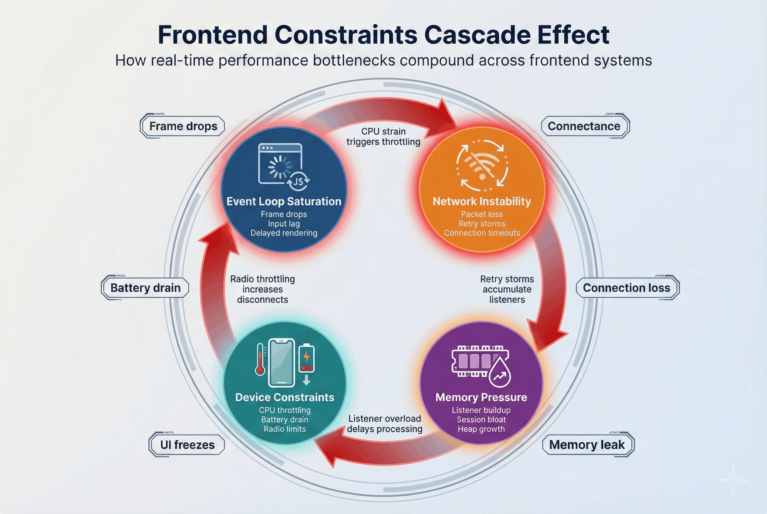 Browser memory limits, CPU scheduling, and network latency directly constrain sustained real-time responsiveness. High event volume delays rendering cycles and increases input lag under limited CPU availability. Packet loss and retry delays cause events to arrive late, duplicated, or out of sequence. Limited mobile CPU, memory, and radio power restrict sustained event processing and persistent connections.