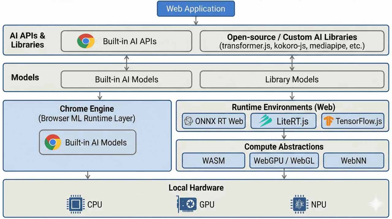 Web AI libraries and built-in Web APIs provide the orchestration layer for AI applications in the browser. They allow developers to select models, download them, cache them locally, and construct task pipelines for processing web-generated data.
